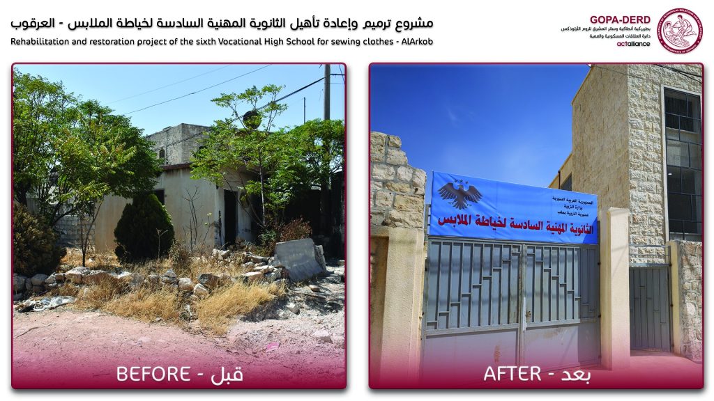 Based on the urgent need to improve the reality of vocational education for girls, GOPA-DERD’s team implemented restoration and rehabilitation project of the Sixth Vocational Secondary School for Clothing Sewing in the Al-Arqoub neighborhood of Aleppo city, in cooperation with UNHCR.